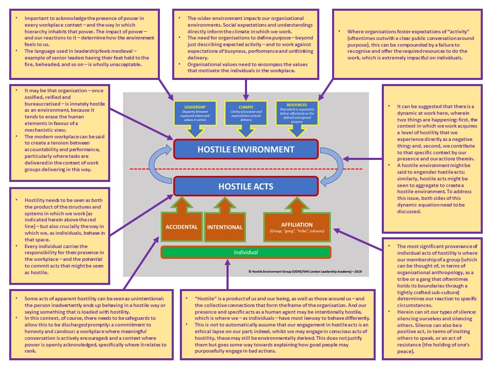 Hostility can be seen as a dynamic interrelationship between our presence in an organisational context as human agents and the structures that frame that context. Our presence shapes the environment…which in turn shapes our presence. Any effort to understand – and to change – the hostility therein needs to concentrate on issues both above and below the line in this model.To better understand the components in this model, my understanding and appreciation of the conversations we had appear herein, so as to add richness and detail to the picture. This material – partial, certainly, insofar as it arises from my understanding of the conversations on the day and the bias that I bring to my appreciation in this context – will hopefully support all of us, whatever our position in the organisation to address issues of hostility, so as to help to make workplaces (especially the NHS) a better place to work.