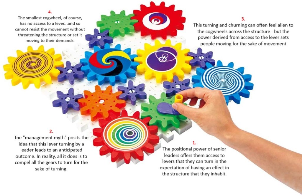 It led to a recollection of the type of gearing toy shown in the picture – and this generated some rich conversation, which, to an extent, connects with recent posts here about “leadership”. And this image is a salutary reminder of the way in which so much management is undergirded by the machine notion: for example, “human resources” (or, even more grimly, the “human capital”) are seen simply as replaceable parts of an overall construction, expected to yield to the demands of that structure and those that seek to direct it.