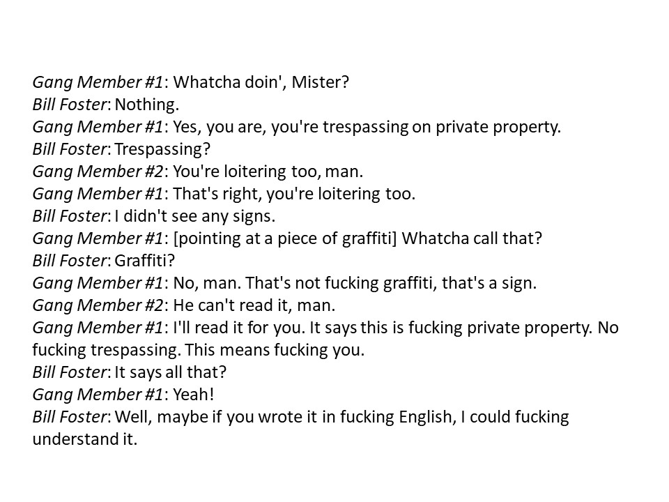 Voice appears in myriad forms. Here we can perhaps see members of a group who feel obliged to contest the power that surrounds them by manifesting their own power in a specific milieu and through a particular voice. That voice is not recognisable to those in dominant groups; it is a vernacular that those people see without acknowledging, other than perhaps to complain about the state of the neighbourhood. Graffiti in this instance is a voice that is not heard by Bill until it is more powerfully articulated to him. And, even then, he continues to seek to silence it by insisting that they abandon their empowering vernacular in favour of the use of a dominant speech and its patterning.