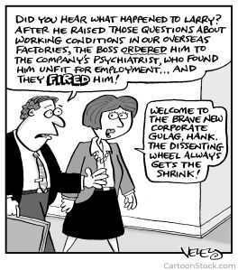 Corporate ‘values’ are an example of enforcing a particular world view on others – they are ideological weapons to police the voices of others, drive out reflection and conversation in preference for compliance (or at least its simulacrum). They create a particular climate of silence.
