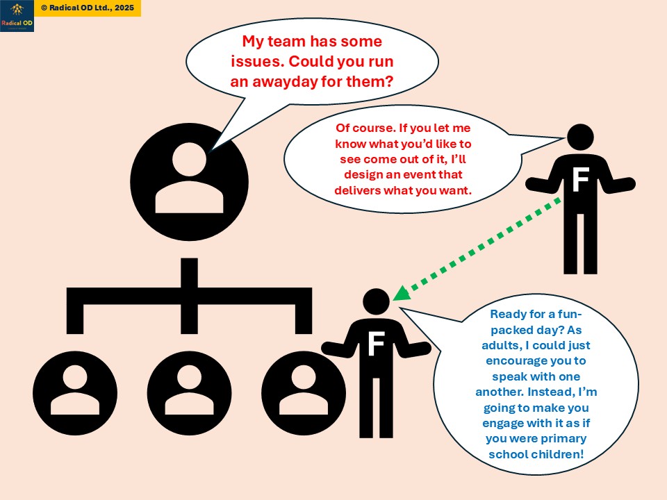 I was always acutely aware of the fact that, when I was asked to facilitate something, such as a team meeting or an awayday, the senior manager who commissioned me to do this work invariably absented themselves from it. I was asked to work with their workforce…but they did not seem to see themselves as part of that group.